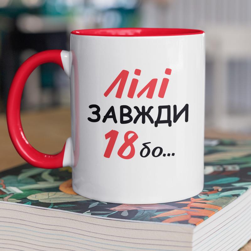 Чашка керамічна з принтом "лілі завжди 18" 330 мл, біла з червоною ручкою