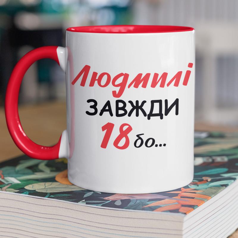 Чашка керамічна з принтом "людмилі завжди 18" 330 мл, біла з червоною ручкою