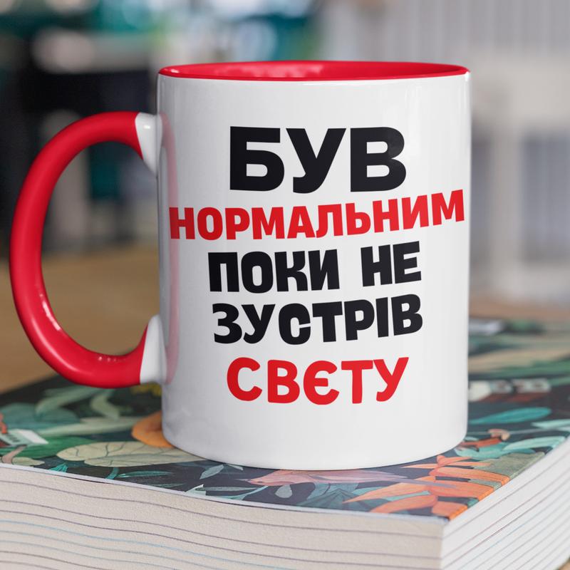 Чашка керамічна з принтом "був нормальним поки не зустрів свєту" 330 мл, біла з червоною р...