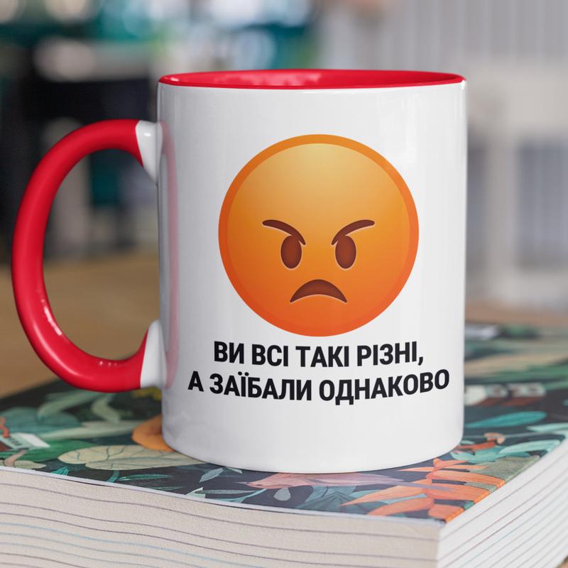 Чашка керамічна з принтом "ви всі такі різні а заїбали однаково" 330 мл, біла з червоною р...