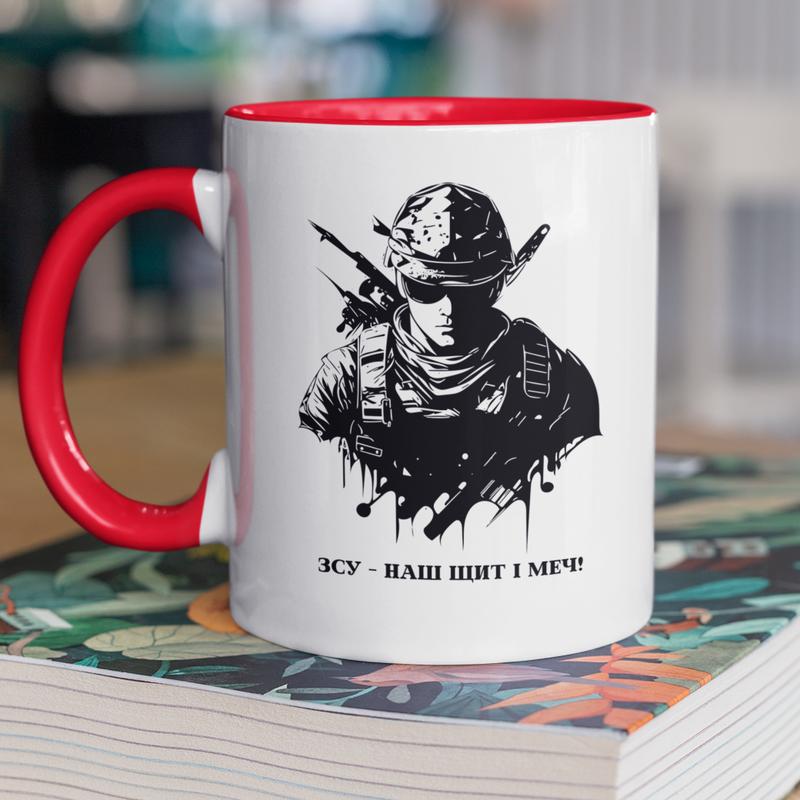 Чашка керамічна з принтом "зсу наш щит і меч" 330 мл, біла з червоною ручкою