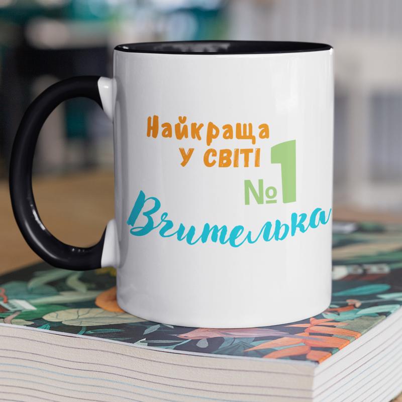 Чашка керамічна з принтом "найкраща у світі вчителька" 330 мл, біла з чорною ручкою