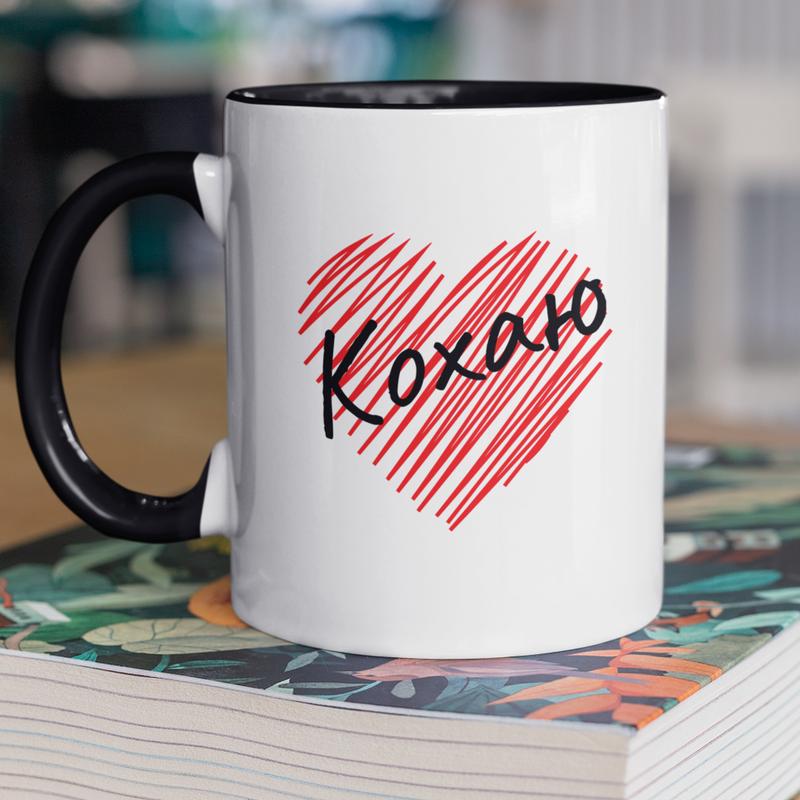 Чашка керамічна з принтом "кохаю" 330 мл, біла з чорною ручкою