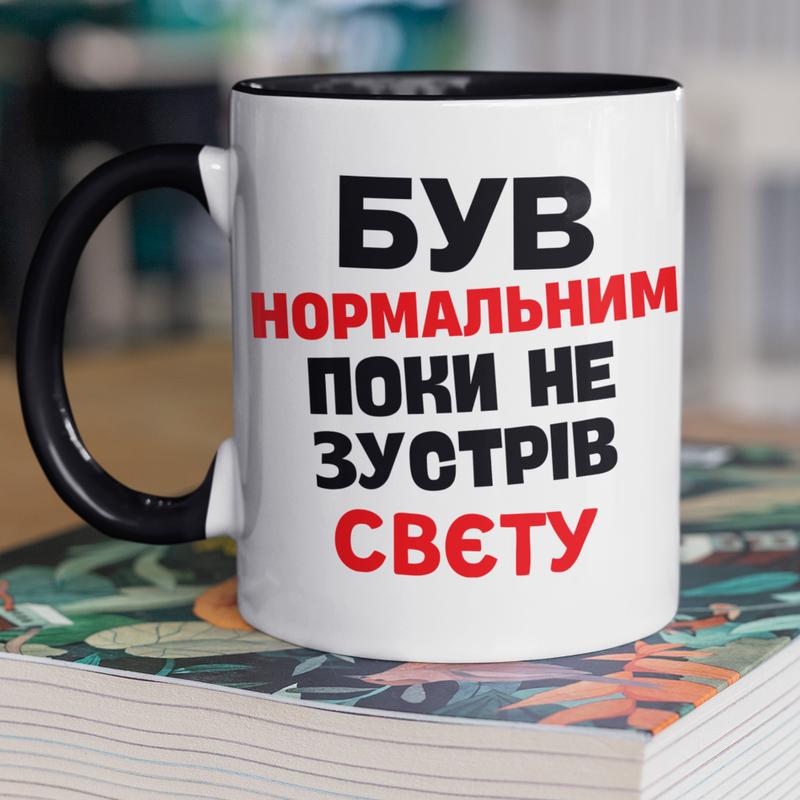 Чашка керамічна з принтом "був нормальним поки не зустрів свєту" 330 мл, біла з чорною руч...