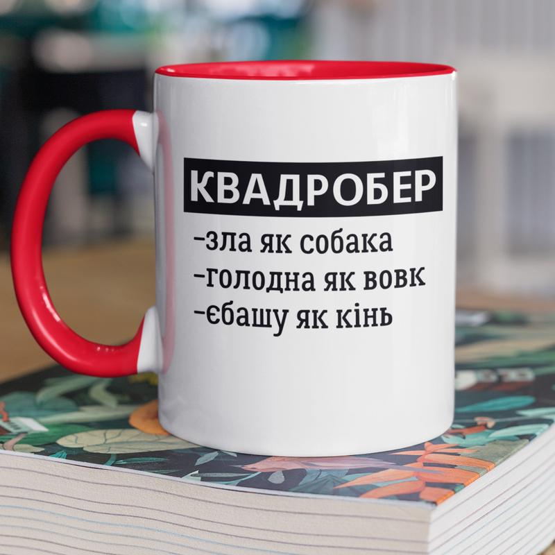 Чашка керамічна з принтом "квадробер жін" 330 мл, біла з червоною ручкою