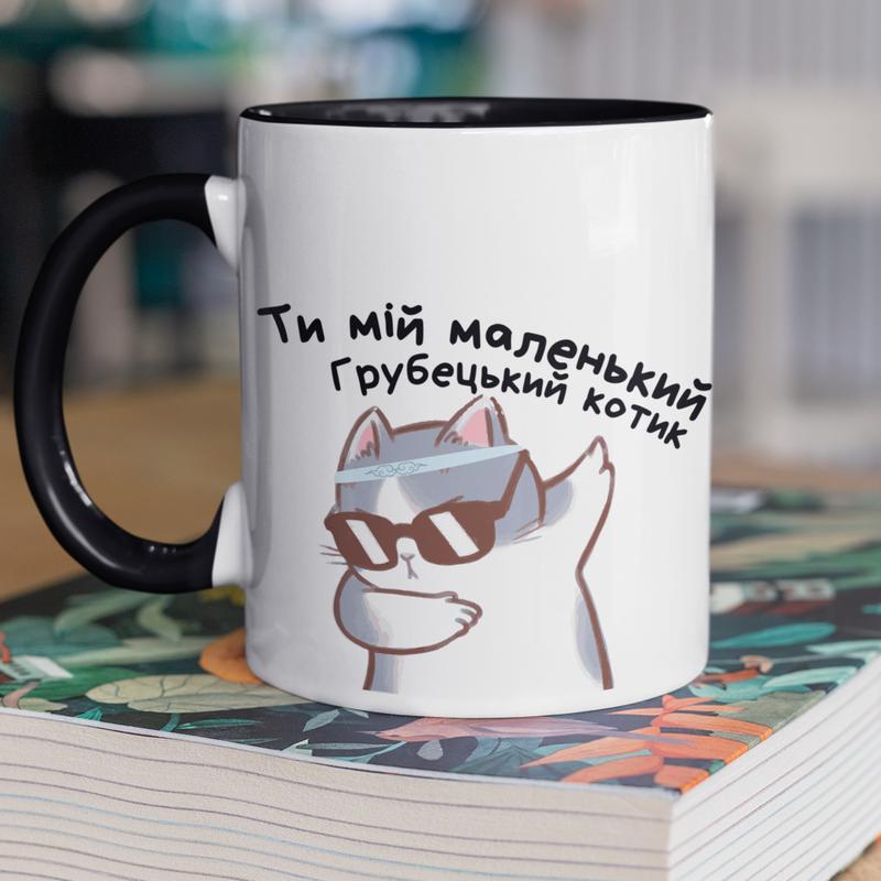 Чашка керамічна з принтом "ти мій грубецький котик" 330 мл, біла з чорною ручкою