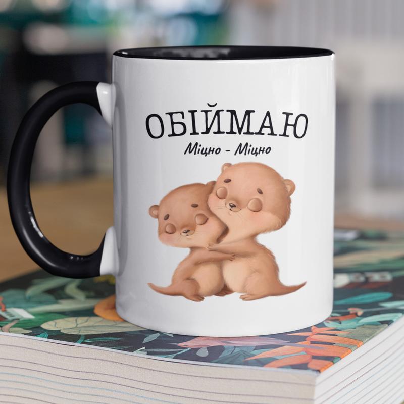 Чашка керамічна з принтом "обіймаю міцно видра" 330 мл, біла з чорною ручкою