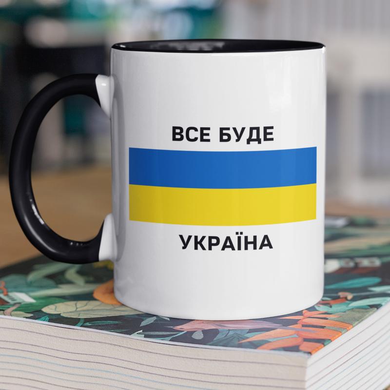 Чашка керамічна з принтом "все буде україна" 330 мл, біла з чорною ручкою