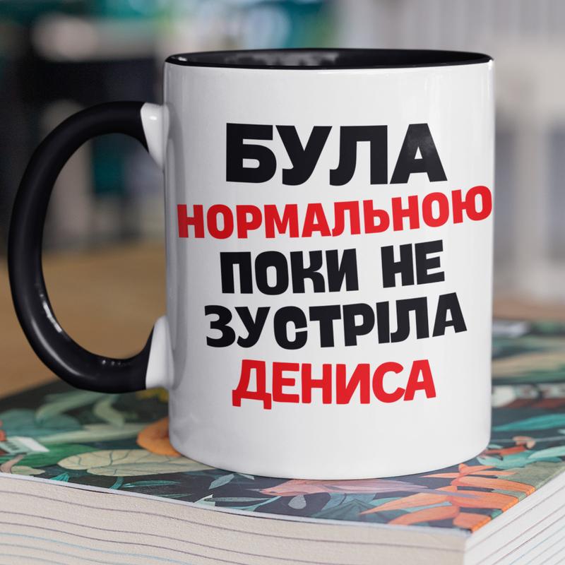 Чашка керамічна з принтом "була нормальною поки не зустріла дениса" 330 мл, біла з чорною...