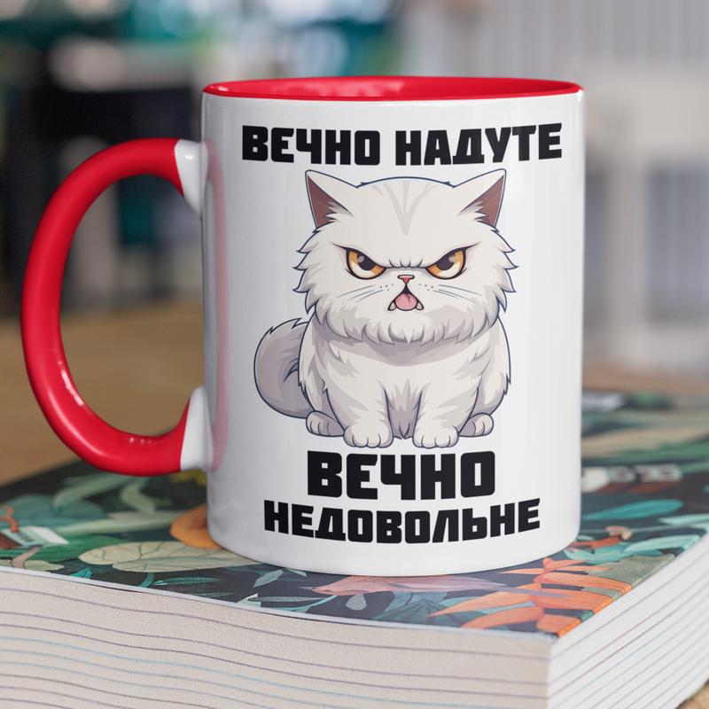 Чашка керамічна з принтом "вєчно недовольне" 330 мл, біла з червоною ручкою