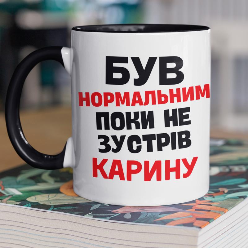 Чашка керамічна з принтом "був нормальним поки не зустрів карину" 330 мл, біла з чорною ру...