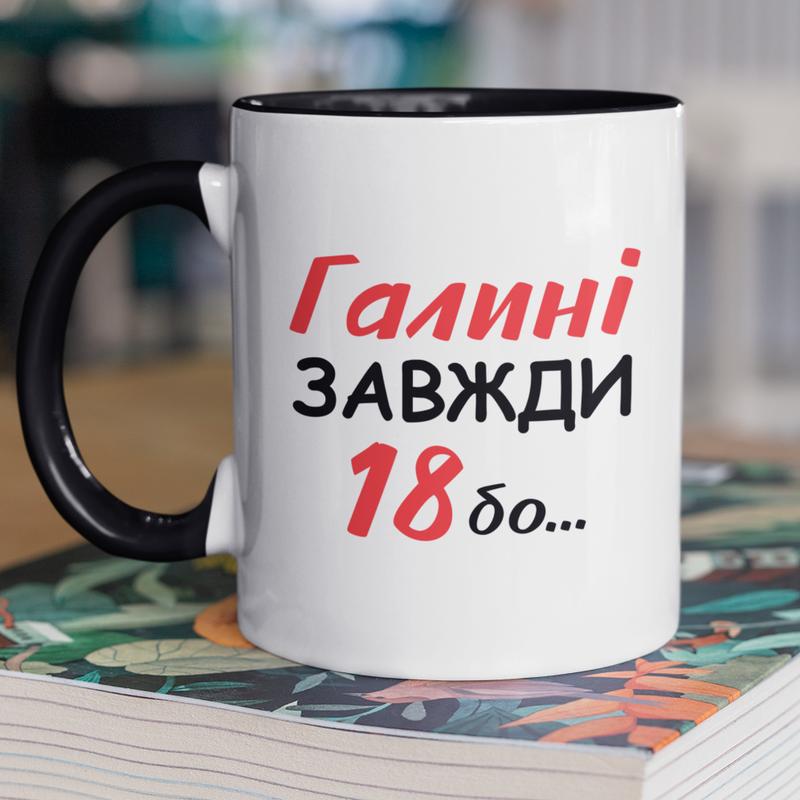 Чашка керамічна з принтом "галині завжди 18" 330 мл, біла з чорною ручкою