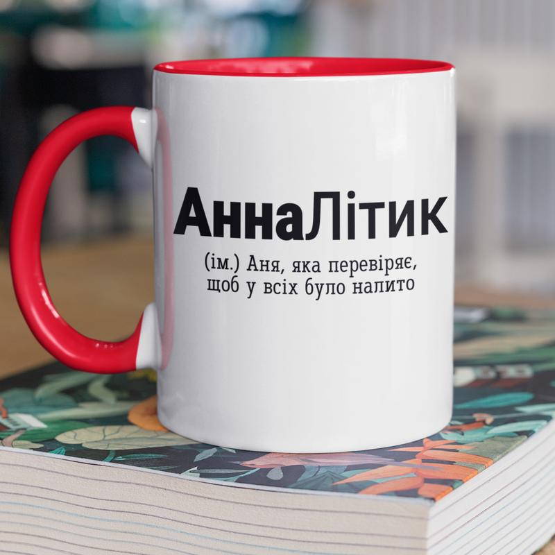 Чашка керамічна з принтом "анналітик" 330 мл, біла з червоною ручкою