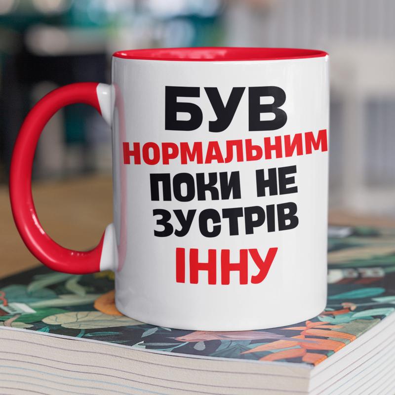 Чашка керамічна з принтом "був нормальним поки не зустрів інну" 330 мл, біла з червоною ру...