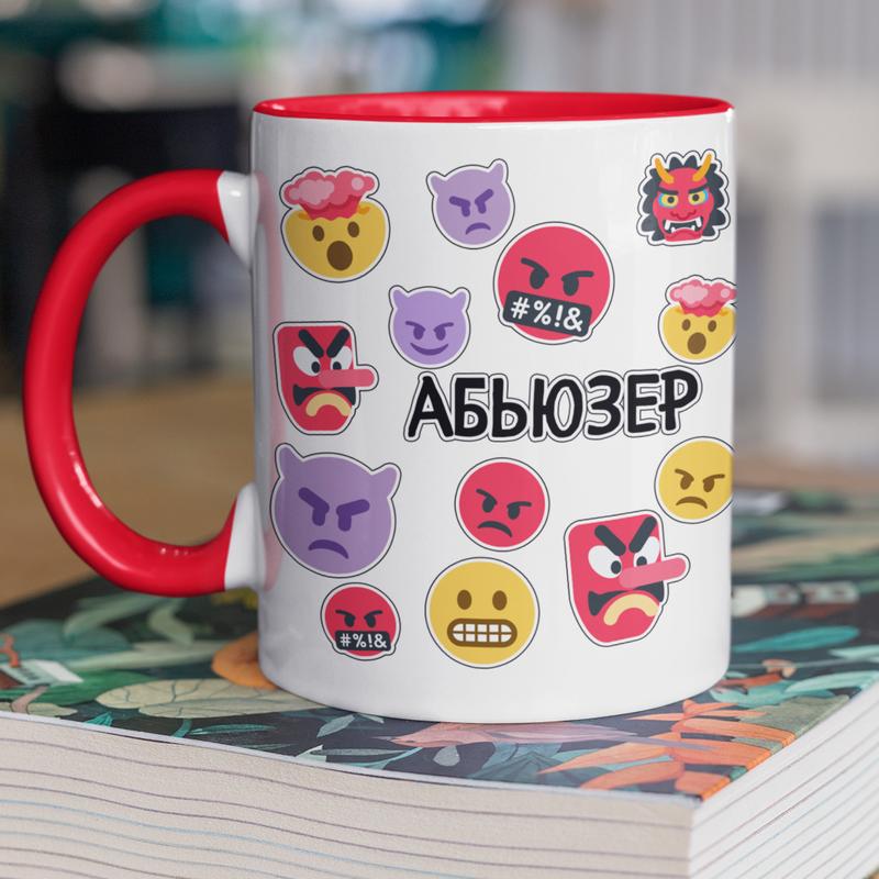 Чашка керамічна з принтом "абьюзер" 330 мл, біла з червоною ручкою