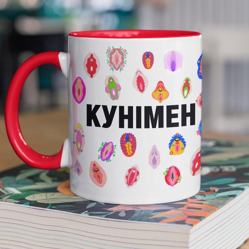 Чашка керамічна з принтом "кунімен" 330 мл, біла з червоною ручкою