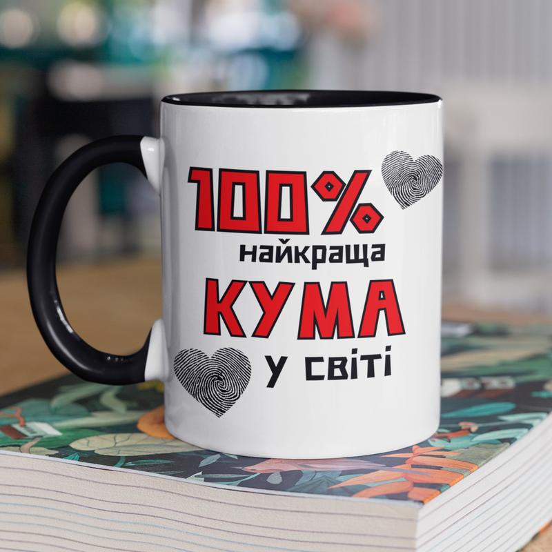 Чашка керамічна з принтом "100 % найкраща кума" 330 мл, біла з чорною ручкою