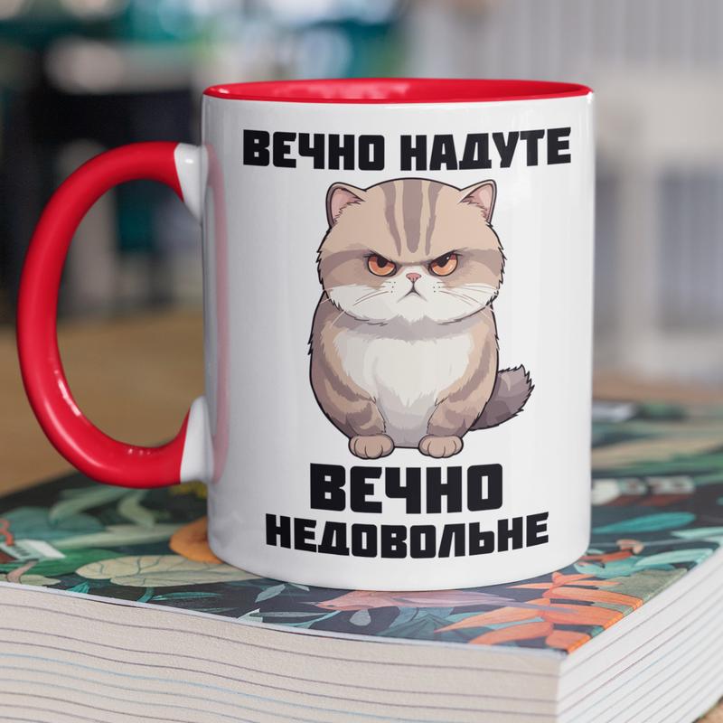 Чашка керамічна з принтом "вєчно недовольне" 330 мл, біла з червоною ручкою