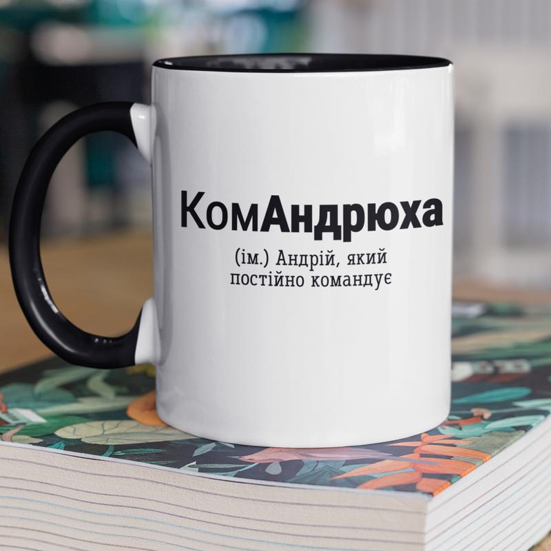 Чашка керамічна з принтом "командрюха" 330 мл, біла з чорною ручкою