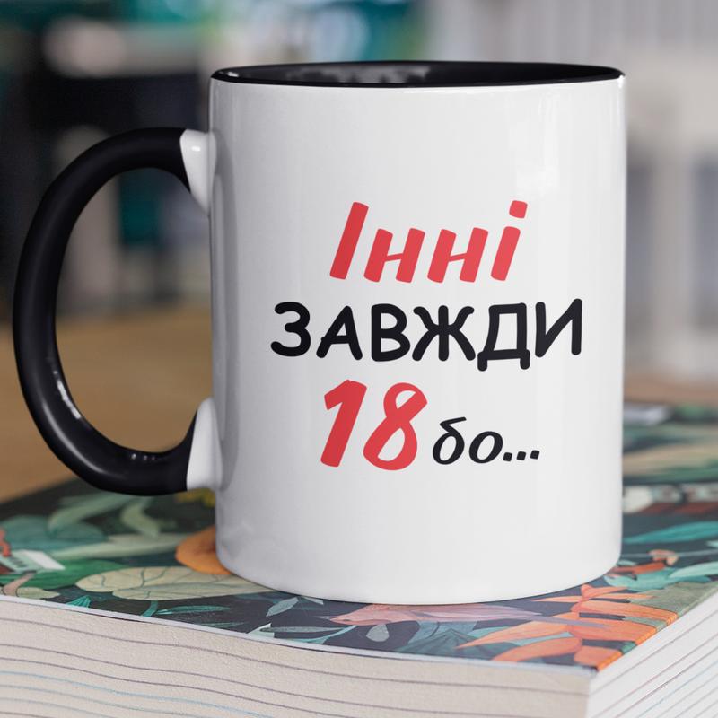 Чашка керамічна з принтом "інні завжди 18" 330 мл, біла з чорною ручкою