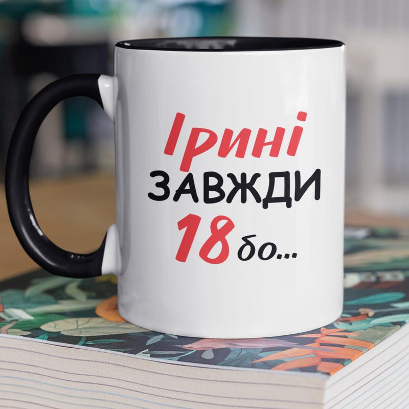 Чашка керамічна з принтом "ірині завжди 18" 330 мл, біла з чорною ручкою