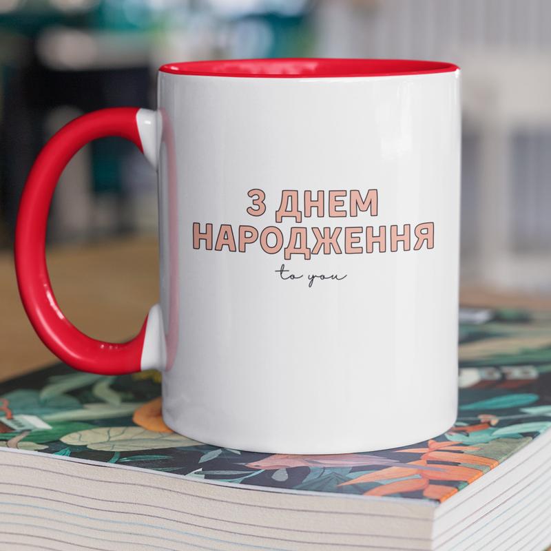 Чашка керамічна з принтом "з днем народження" 330 мл, біла з червоною ручкою
