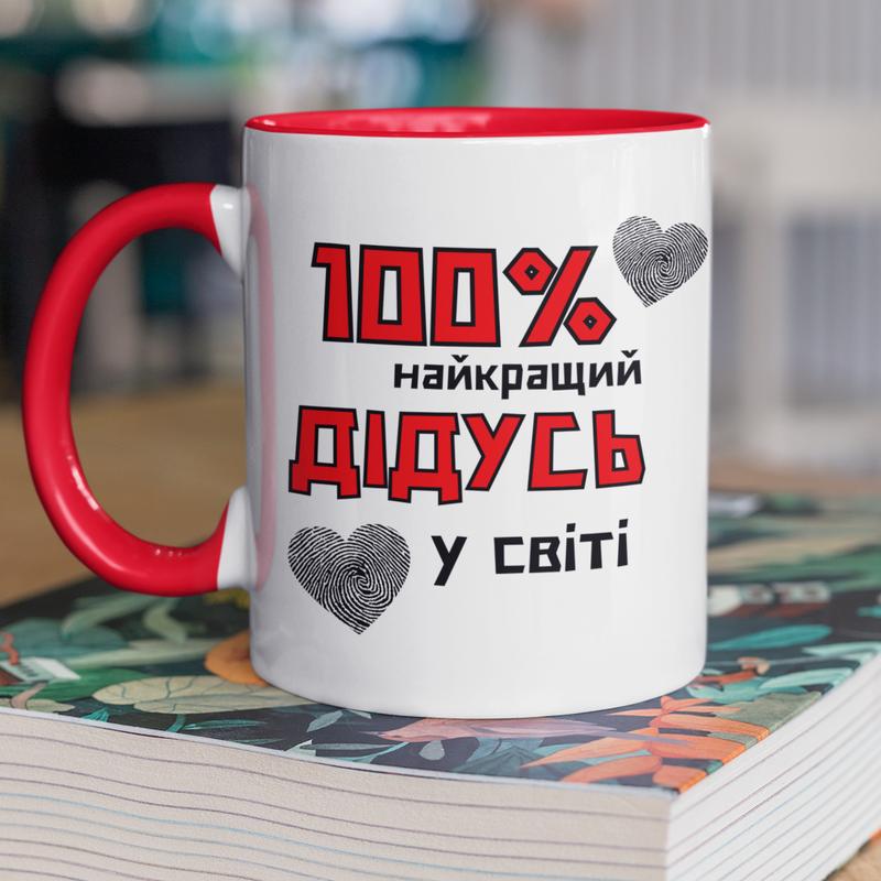 Чашка керамічна з принтом "100 найкращий дідусь" 330 мл, біла з червоною ручкою