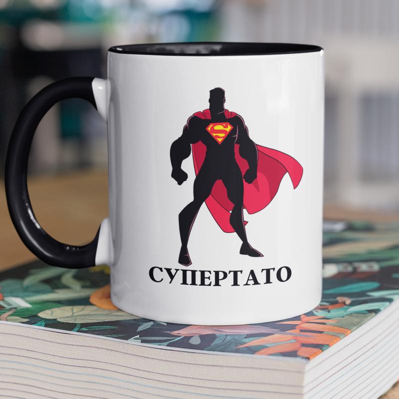 Чашка керамічна з принтом "супертато" 330 мл, біла з чорною ручкою