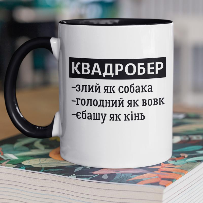 Чашка керамічна з принтом "квадробер чол" 330 мл, біла з чорною ручкою
