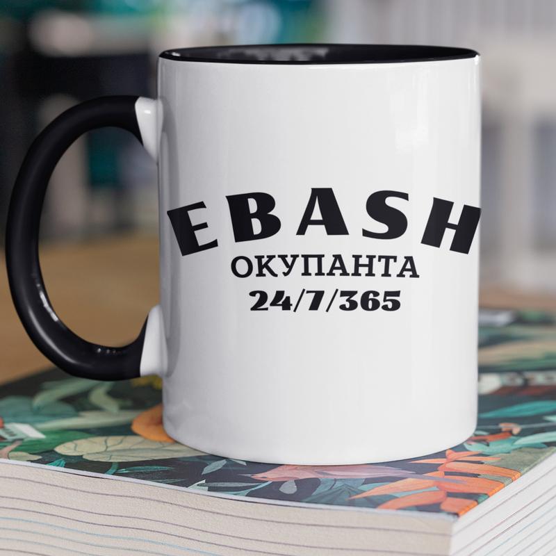 Чашка керамічна з принтом "єбаш окупантів" 330 мл, біла з чорною ручкою