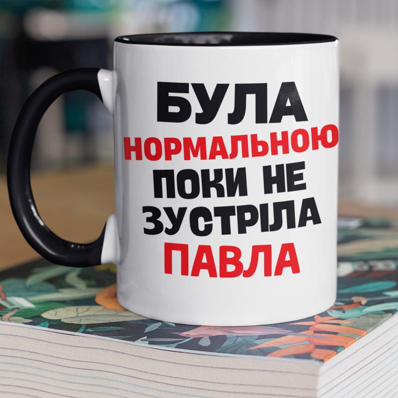 Чашка керамічна з принтом "була нормальною поки не зустріла павла" 330 мл, біла з чорною р...