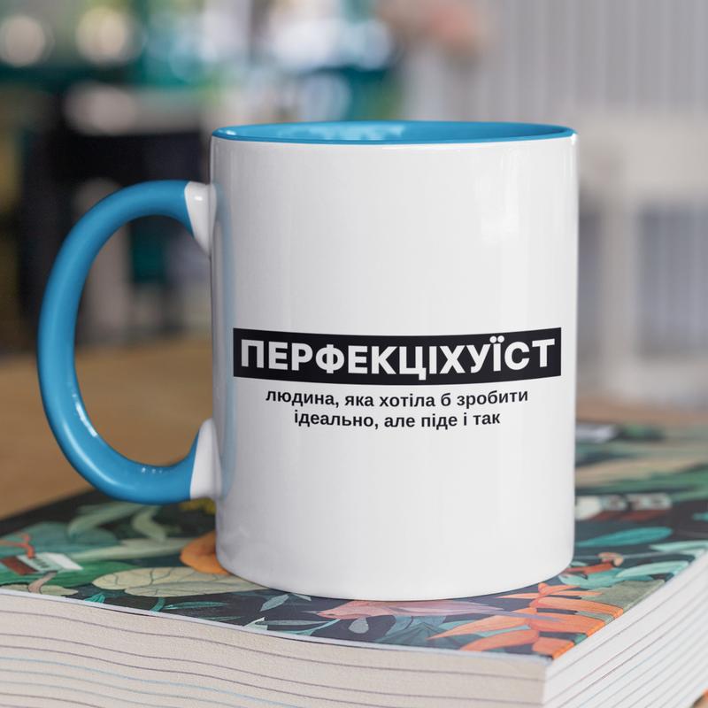 Чашка керамічна з принтом "перфекціхуїст" 330 мл, біла з блакитною ручкою