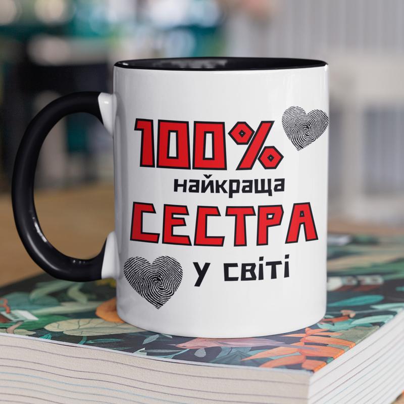 Чашка керамічна з принтом "100 % найкраща сестра" 330 мл, біла з чорною ручкою