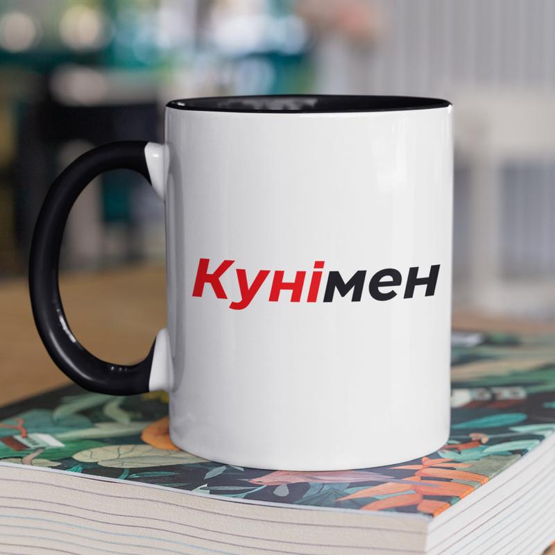 Чашка керамічна з принтом "кунімен" 330 мл, біла з чорною ручкою