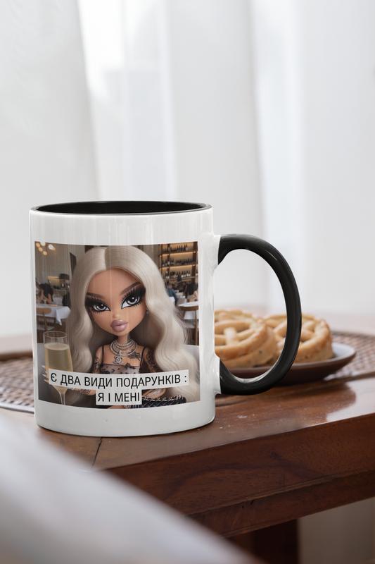Чашка керамічна з принтом "є два види подарунків я і мені" 330 мл, біла з чорною ручкою