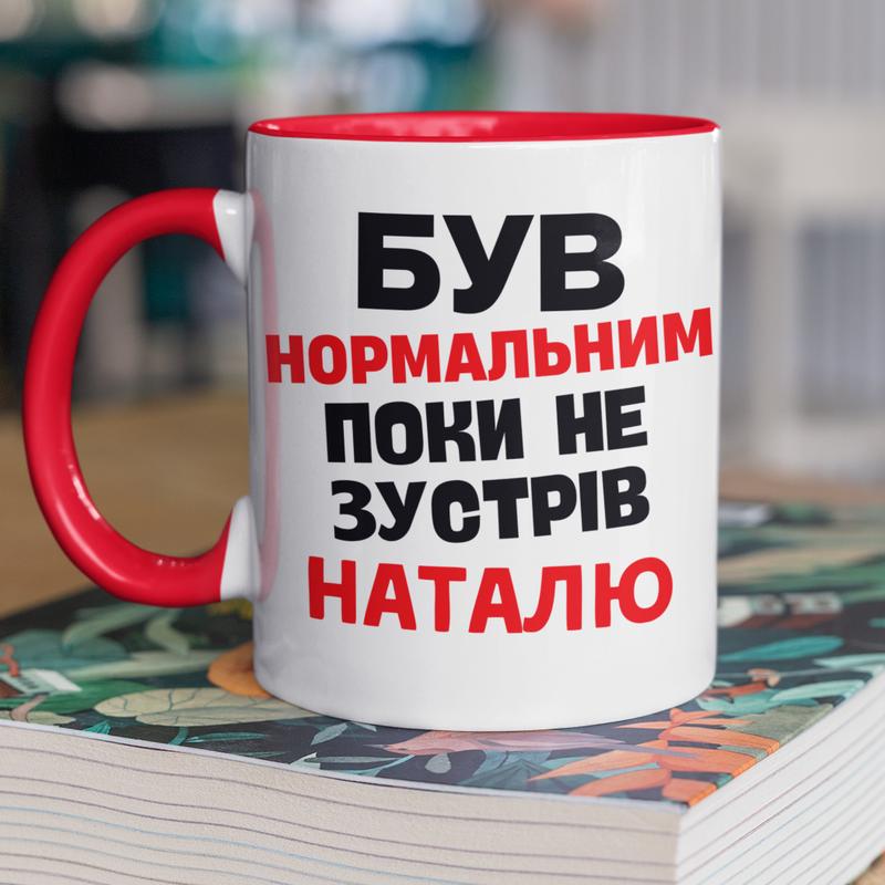 Чашка керамічна з принтом "був нормальним поки не зустрів наталю" 330 мл, біла з червоною...