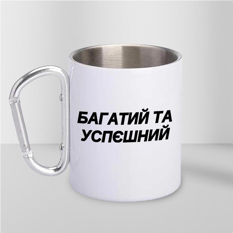 Чашка металева з принтом "багатий та успєшний" 300 мл з карабіном, біла