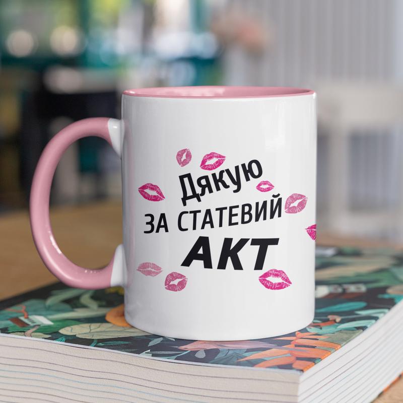 Чашка керамічна з принтом "дякую за акт" 330 мл, біла з рожевою ручкою