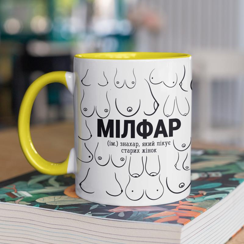 Чашка керамічна з принтом "мілфар" 330 мл, біла з жовтою ручкою