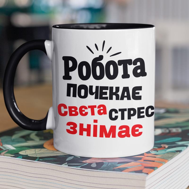 Чашка керамічна з принтом "свєта стрес знімає" 330 мл, біла з чорною ручкою