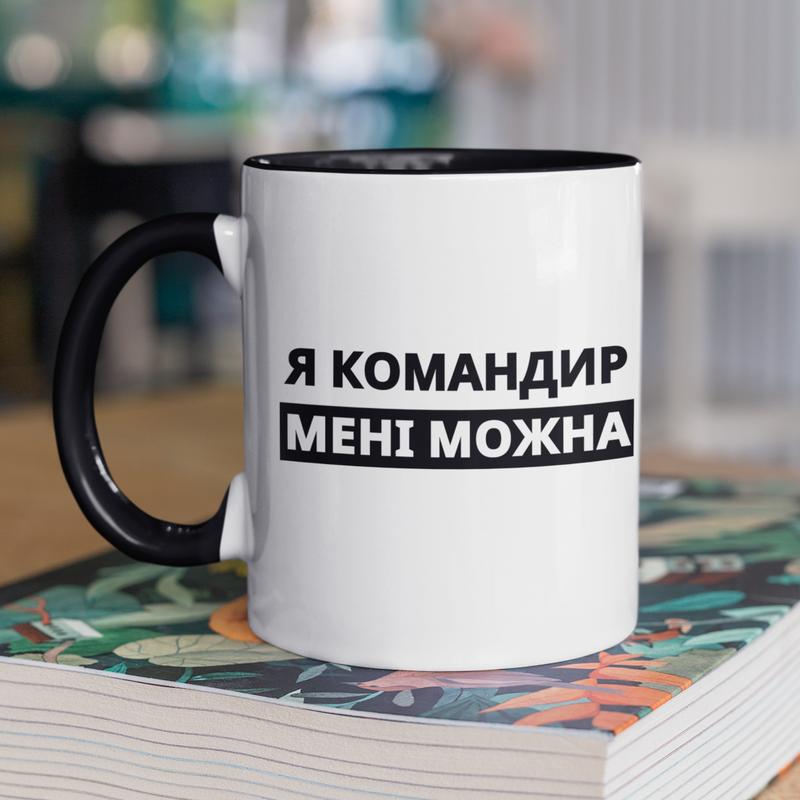 Чашка керамічна з принтом "я командир мені можна" 330 мл, біла з чорною ручкою