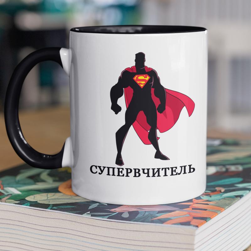 Чашка керамічна з принтом "супервчитель" 330 мл, біла з чорною ручкою
