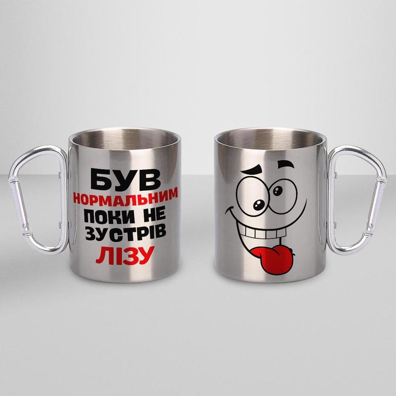 Кружка металева з карабіном "був нормальним поки не зустрів лізу" 300 мл срібляста