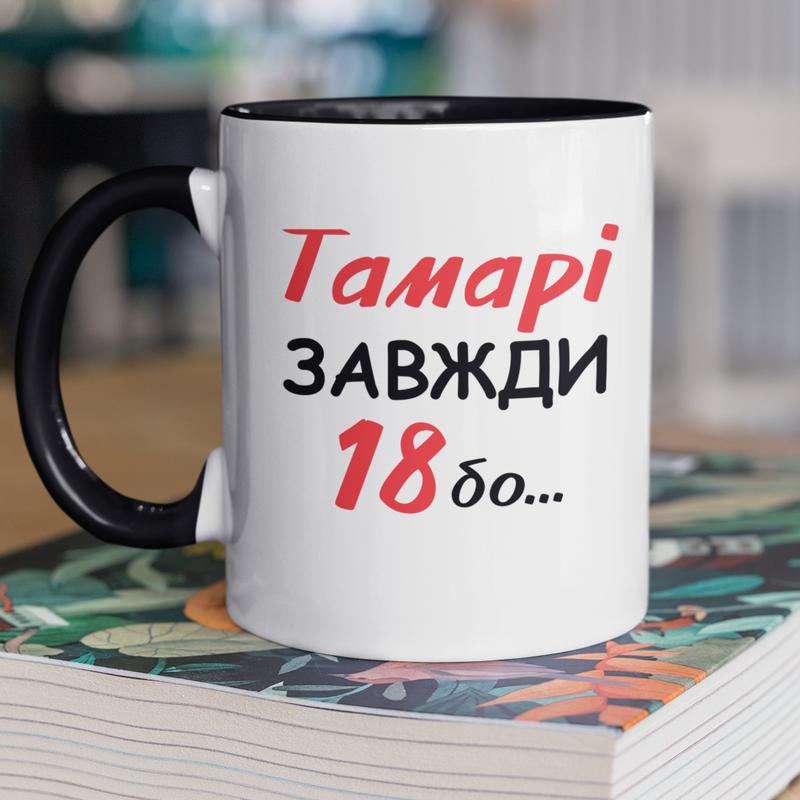 Чашка керамічна з принтом "тамарі завжди 18" 330 мл, біла з чорною ручкою