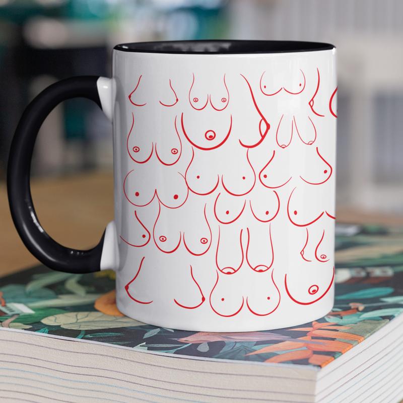 Чашка керамічна з принтом "цицьки" 330 мл, біла з чорною ручкою