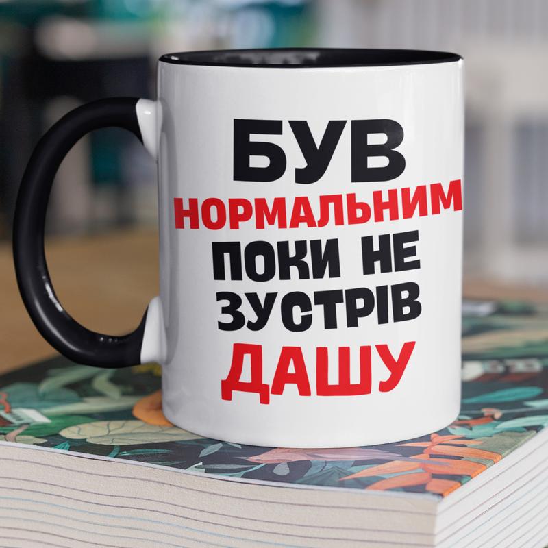 Чашка керамічна з принтом "був нормальним поки не зустрів дашу" 330 мл, біла з чорною ручк...