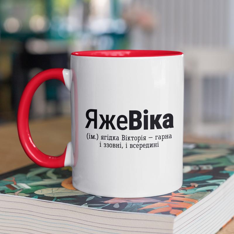 Чашка керамічна з принтом "яжевіка" 330 мл, біла з червоною ручкою