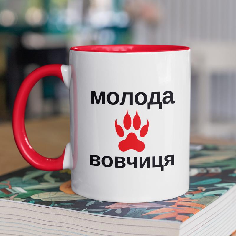 Чашка керамічна з принтом "молода вовчиця" 330 мл, біла з червоною ручкою