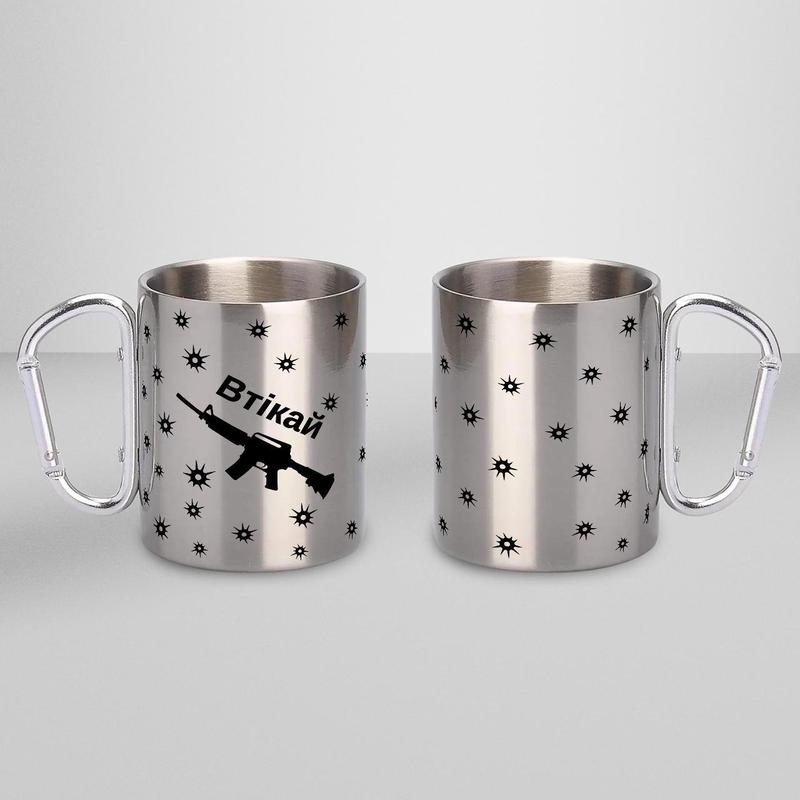 Чашка металева з принтом "втікай" 300 мл з карабіном, срібляста