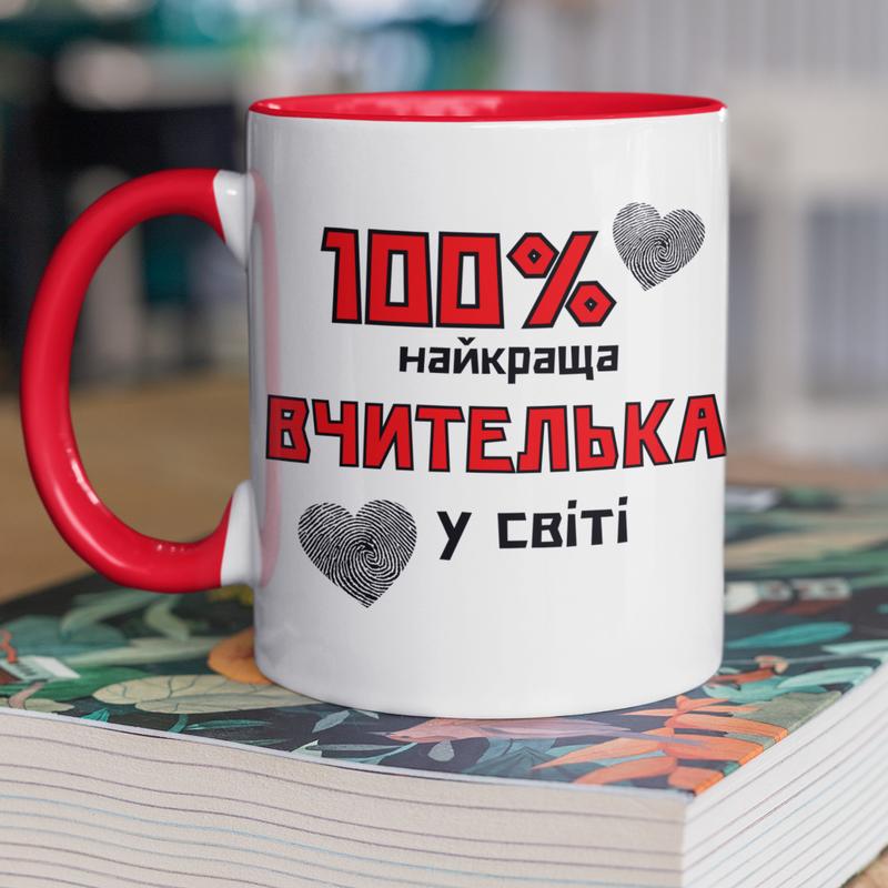 Чашка керамічна з принтом "100 найкраща вчителька" 330 мл, біла з червоною ручкою